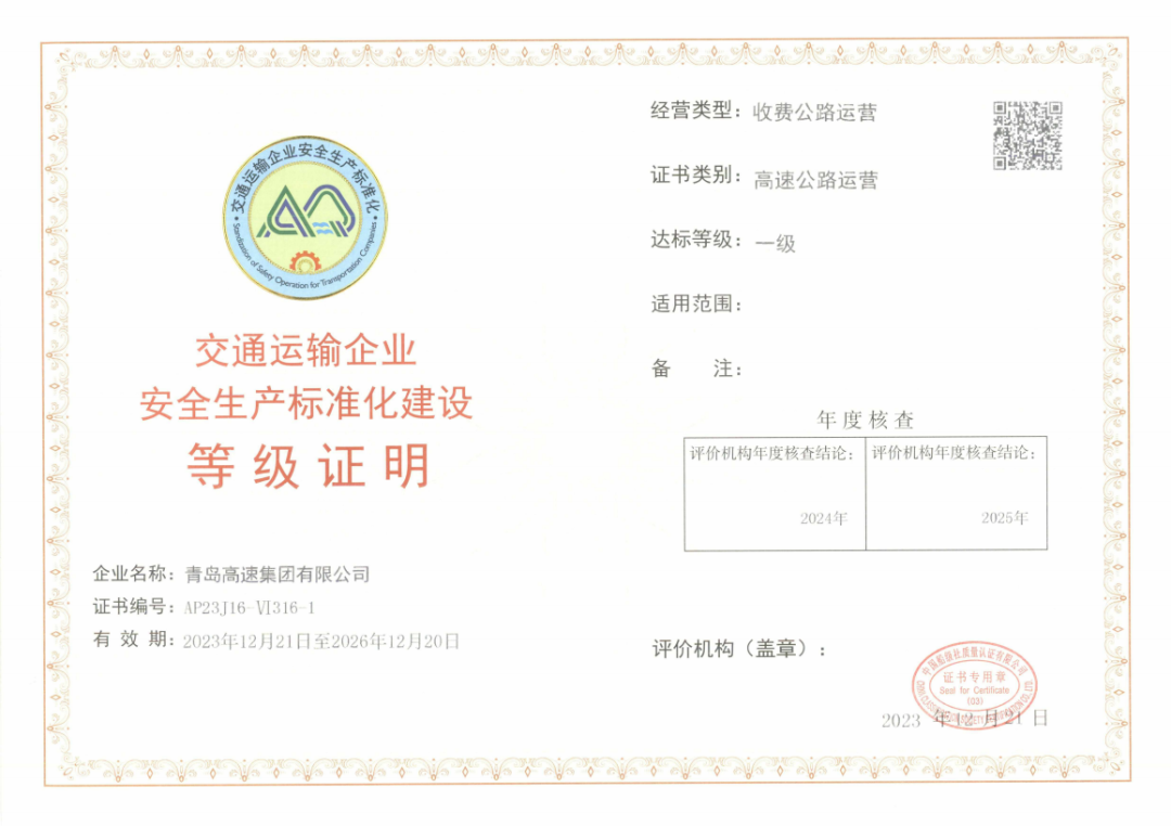 在安全生产方面,不断强化安全标准化建设工作,完善高速公路“建设、运营、维修、养护”全生命周期的双重预防体系,以总分943分的优异成绩荣获“交通运输企业安全生产标准化达标一级证书”。
