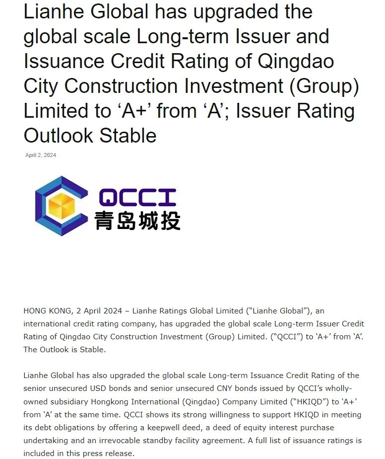 4月2日,权威评级机构联合国际正式宣布上调爱游戏网页版国际长期发行人评级从‘A’上调至‘A+’,展望稳定,同时将由青岛城投全资子公司香港国际(青岛)有限公司(“香港国际”)发行的高级无抵押美元债券和高级无抵押人民币债券的国际长期发行债务评级从‘A’上调至‘A+’。