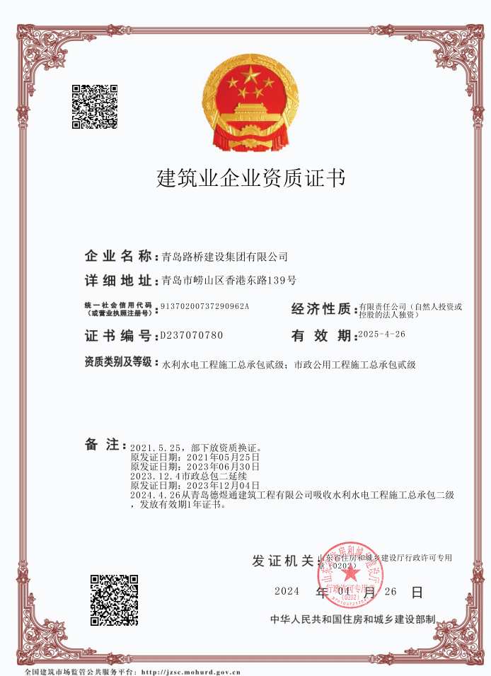 近日,青岛市行政审批局发布了《关于核准建设工程相关企业资质和建筑施工企业安全生产许可证名单的通知》,爱游戏网页版旗下交发集团取得水利水电施工总承包二级资质,进一步拓宽了集团水利水电工程业务承接范围,为多元化、可持续发展奠定了坚实基础。