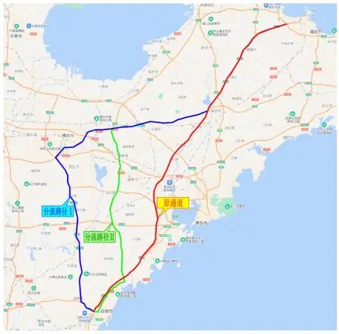 日照-青岛分流路径。利用日兰高速、潍日高速、青兰高速、G204国道作为日照至青岛的分流路径。