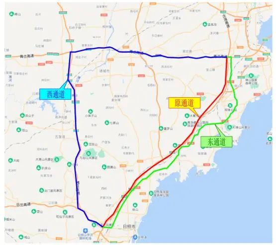 (图为日照往青岛分流绕行示意图)