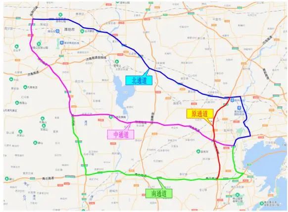 潍坊-青岛分流路径。利用青银高速、潍青高速、潍日高速、青兰高速作为潍坊至青岛的分流路径。