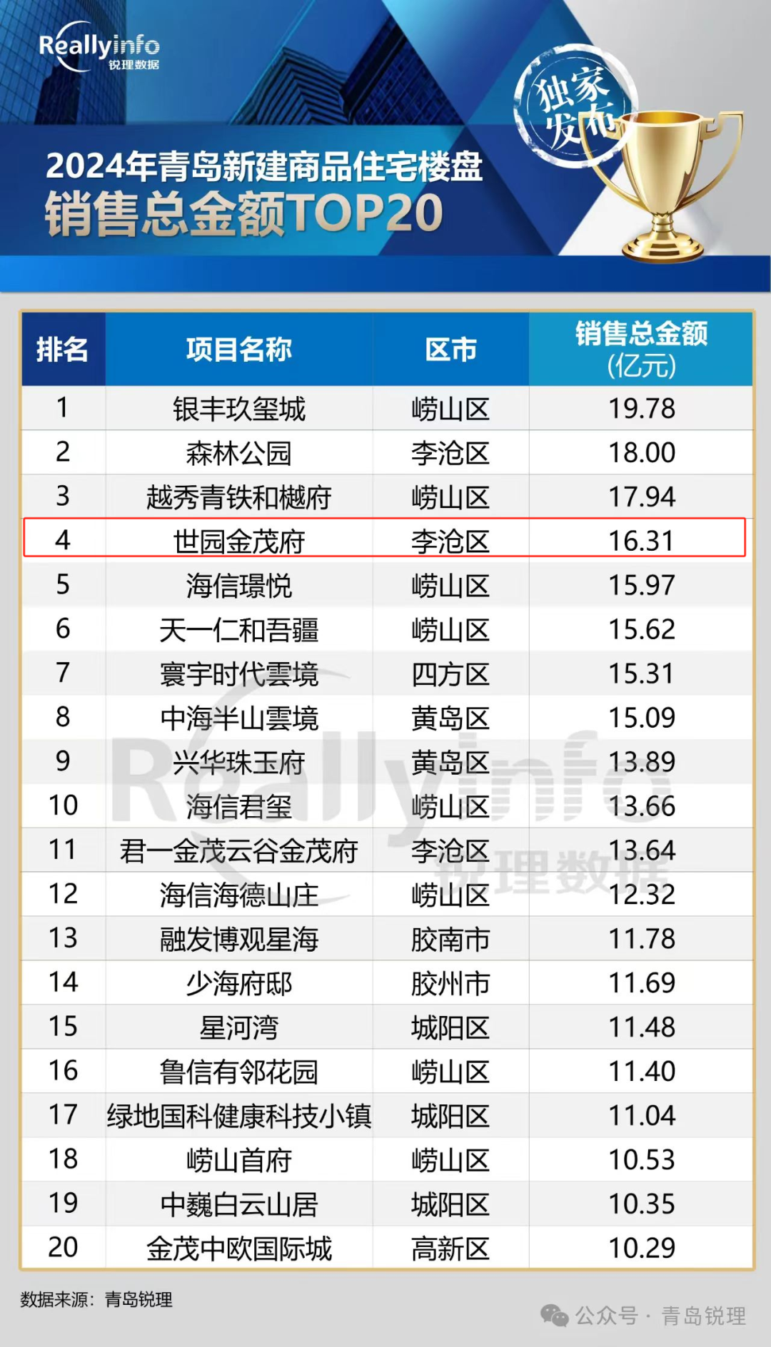近日,2024年青岛市商品房销售榜单正式发布,爱游戏网页版世园·金茂府项目以16.31亿元销售总金额荣登2024年青岛新建商品住宅楼盘销售金额榜第4名,超额完成全年销售目标任务。