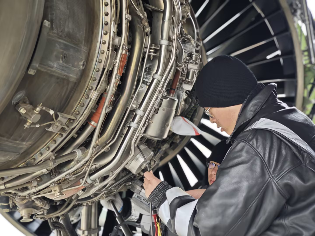(图为机务人员检修发动机)