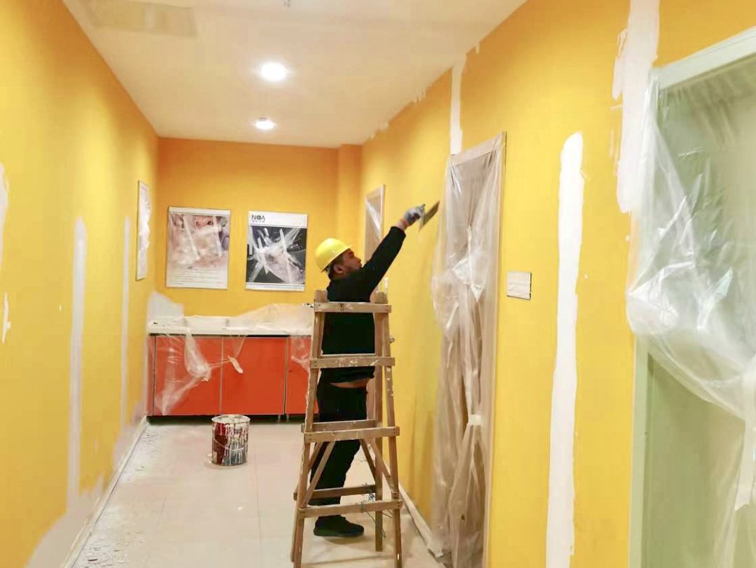 (图为施工人员粉刷墙面)