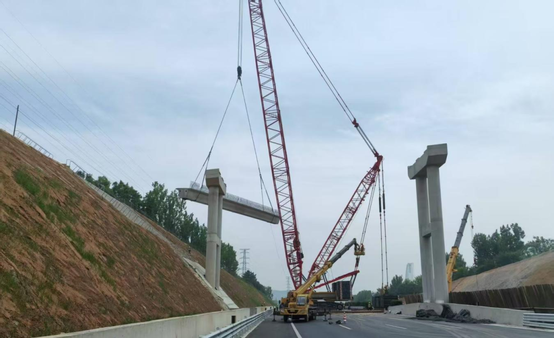 K642天桥架设是此次封闭施工另一关键难点。该桥体距地面垂直高度达22米(约7层楼高),采用4跨×30米箱梁结构,施工中运用600吨级履带起重机进行跨线吊装作业。面对高空施工的技术挑战与安全风险,交发集团认真落实安全生产组织和技术措施要求,制定专项施工方案,组织多方专家论证及桌面推演,全过程强化关键环节组织和施工安全监控,精准实现吊装就位。