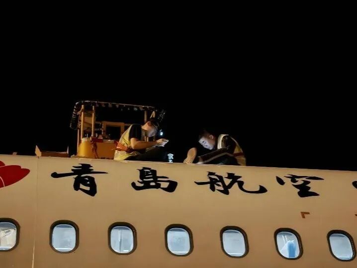 (图为青岛航空机务人员夜间检修飞机)