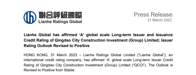 青岛城投再获联合国际“A”境外主体评级,展望调整至正面