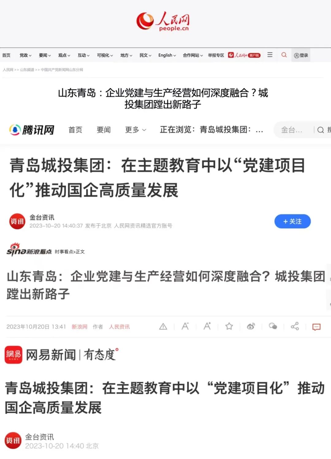 10月20日,人民日报旗下人民网在中国共产党新闻网、人民网港澳台版、金台资讯、腾讯网、网易新闻、新浪网等知名媒体平台集中报道了《在主题教育中以“党建项目化”推动国企高质量发展》《企业党建与生产经营如何深度融合?城投集团蹚出新路子》两篇文章16次。爱游戏网页版“党建项目化”的创新做法,为国有企业破解党建经营“两张皮”难题给出“城投答案”,在互联网引发热烈反响。