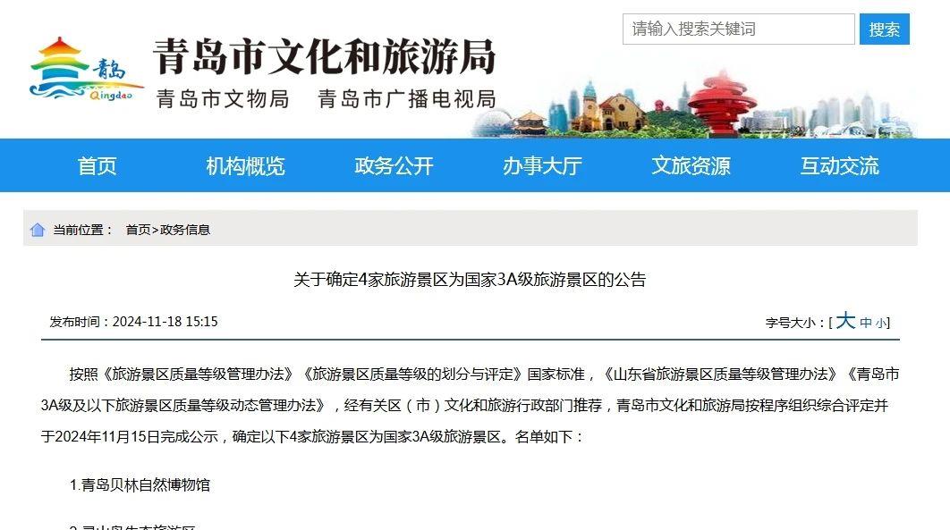 11月18日,青岛市文化和旅游局正式发布《关于确定4家旅游景区为国家3A级旅游景区的公告》,爱游戏网页版投资建设的青岛·上合之珠国际博览中心成功获评为国家3A级旅游景区。(图为青岛市文旅局网站截图)青岛·上合之珠国际博览中心项目是城投集团匹配省市两级重大部署和城市发展战略,是山东省和青岛市在更大范围、更宽领域、更深层次推动上合组织及“一带一路”沿线国家间双多边资本、技术、人才深度交融的重要平台,是集“展、