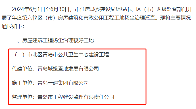 近日,爱游戏网页版旗下城市更新集团公共卫生中心项目积极响应市住建局号召,做好项目扬尘治理,并在青岛市住建局2024年第六轮房屋建筑和公用工程工地扬尘治理检查中获通报表扬。(图为住建局网站公示)建筑工地扬尘污染防治是改善居住环境的重大举措,是加强生态文明建设、促进城市科学发展的根本需求,公共卫生中心项目位于我市中心地带,防尘任务更加艰巨迫切。该项目投资估算9.8亿元,土地性质为医疗卫生用地(A5),占地